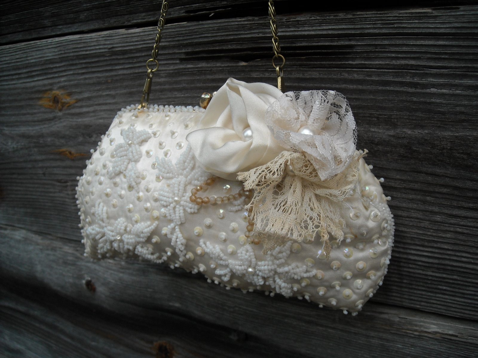 I bought some vintage handbags, beat up ones, from Etsy sellers. Then I made little flowers and beaded thingys and attached them. I had to buy a purse handle from overseas for one. With the Iceland volcano, it was deeeelaaaaayed big time.